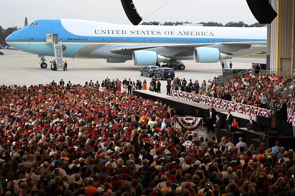 Gathering thousands of cheering supporters inside an airport hangar, Mr Trump put aside the stress of Washington governing and returned to the campaign trail, where he reprised many of his greatest-hits themes and lines from last year and drank in the adulation of the crowd. Buoyant and energised, he invited one fan onto the stage for a hug and even briefly turned over the microphone.