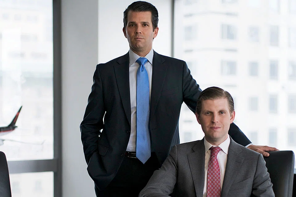 But just one flight down, in Eric and Donald Jr's cramped offices, their father is ever-present - on the cover of a recent issue of Golf Digest, in his visage looping endlessly on CNN, in the cardboard cut-out of the president watching from behind a stash of blueprints in a corner.