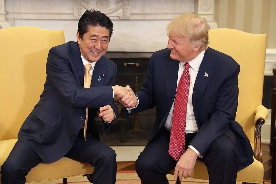 [WASHINGTON] President Donald Trump welcomed Japanese Prime Minister Shinzo Abe with a brotherly hug and warm words of admiration Friday, as he ditched previously hard-charging rhetoric towards Tokyo during a White House summit.