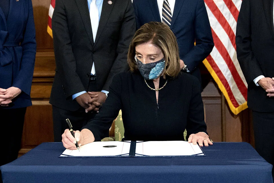 At a later ceremony, she signed the article of impeachment before, saying she did this "sadly, with a heart broken over what this means to our country."