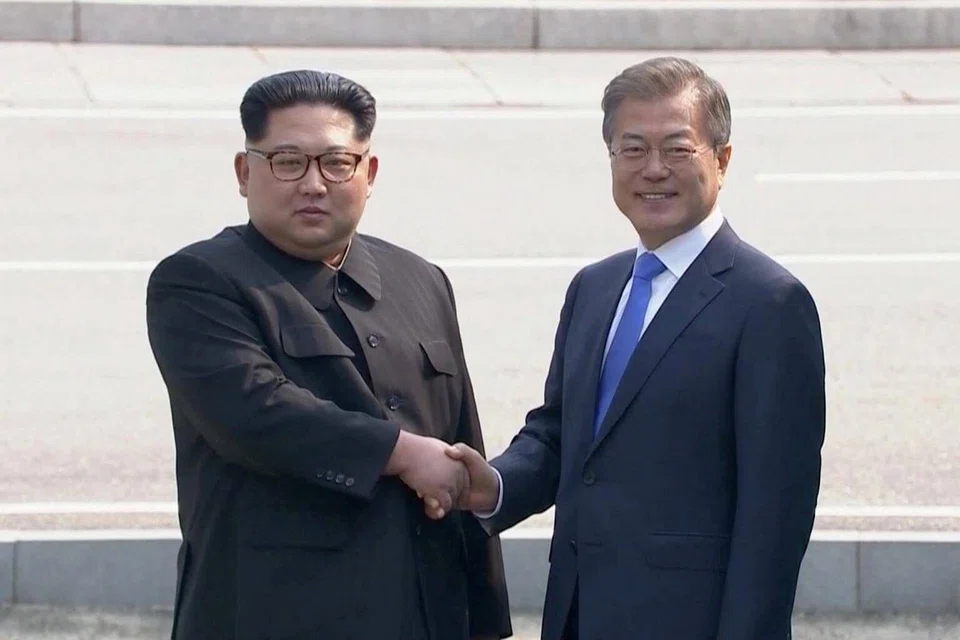 [SEOUL] North Korean leader Kim Jong Un and the South's President Moon Jae In shook hands on Friday over the Military Demarcation Line that divides their countries in a gesture laden with symbolism ahead of a historic summit.