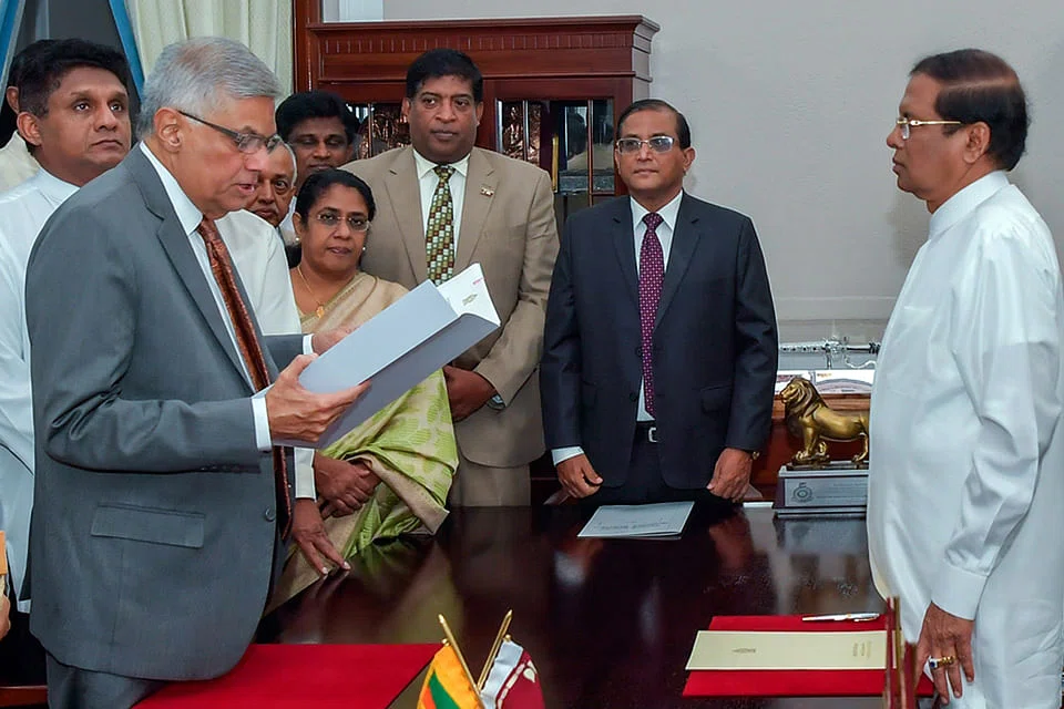 The swearing-in ceremony was closed to the media and only a few lawmakers from Mr Wickremesinghe's coalition were present, an official in the president's office said. The official did not want to be named. Mr Wickremesinghe, who has never completed a full term as prime minister, was appointed to the post for the fifth time. The South Asian island country's parliament had voted to cut the budget for Mr Rajapaksa and his ministers after Mr Sirisena refused to accept no-confidence votes against Mr Rajapaksa, saying that due process was not followed.