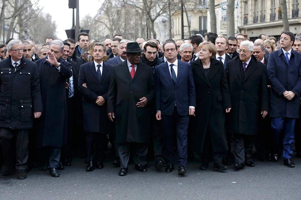President Francois Hollande and leaders from Germany, Italy, Israel, Turkey, Britain and the Palestinian territories, among others, moved off from the central Place de la Republique ahead of a sea of French and other flags. Giant letters attached to a statue in the square spelt out the word Pourquoi?" (Why?) and small groups sang the "La Marseillaise" national anthem.