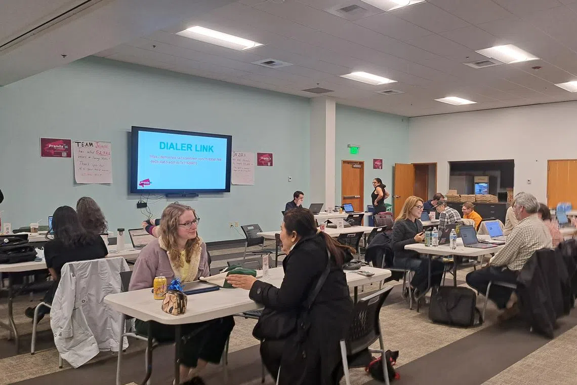 At the party’s phone bank in Seattle, volunteers make cold calls to connect with voters and make a final pitch for the sitting vice-president