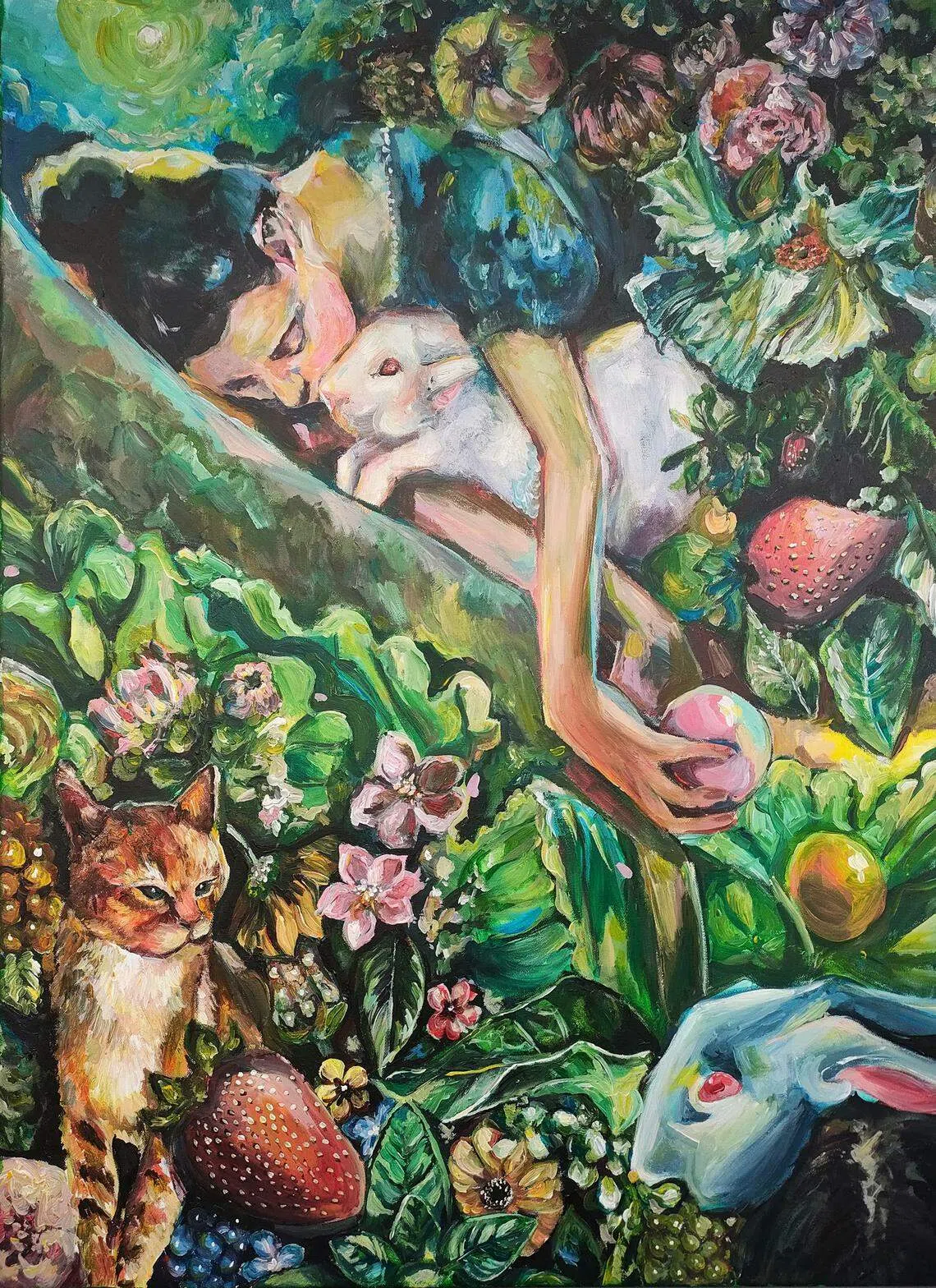 Among the winning artworks is Dreams, a gorgeously executed painting of a young woman asleep with a rabbit, amid lush surroundings.