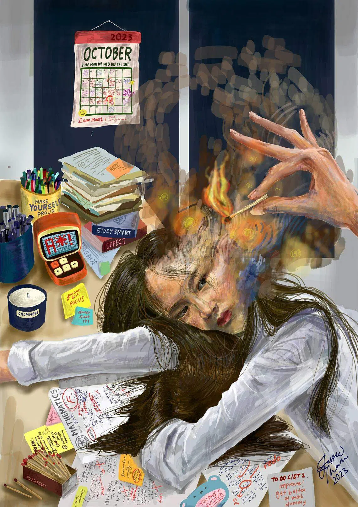 The artist, 15-year-old Sun Jia Ze of Nanyang Girls’ High School, says: “I was inspired by the story of Alice In Wonderland and my own internal quest for solace during the more challenging months of school… The various elements of the painting, such as the flowers, fruits and cat, embody the vivid imagery of my dreams and my yearning for rest.”