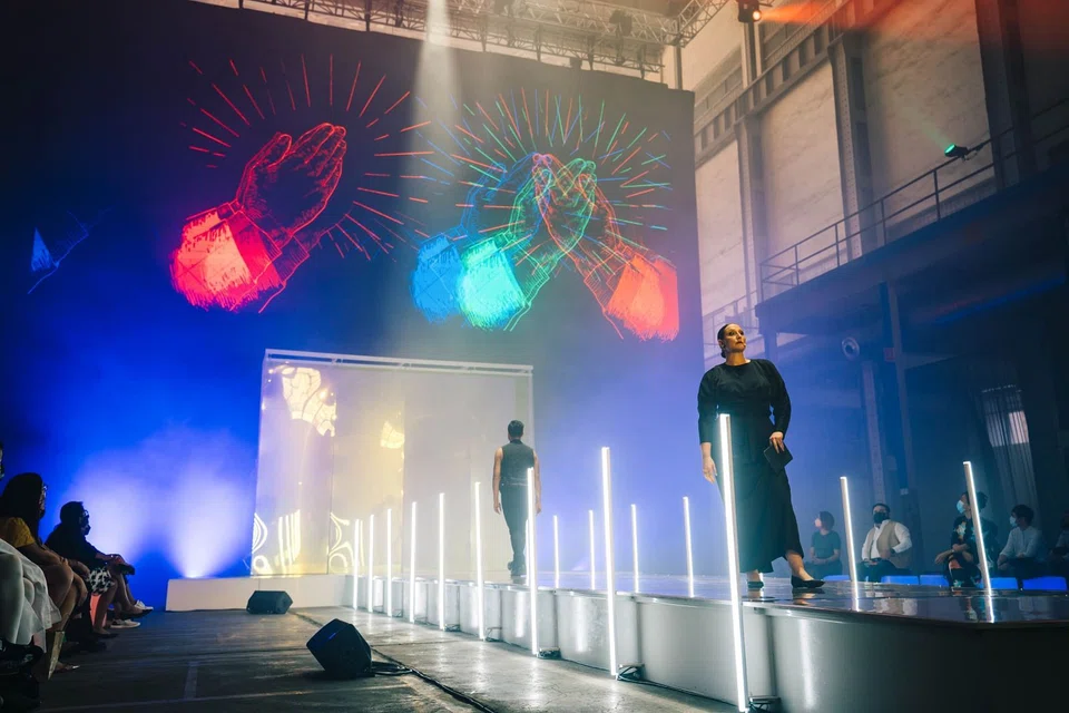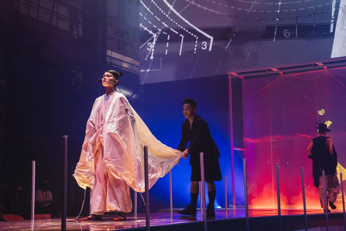 At the disused Pasir Panjang Power House, Indian bharatanatyam dancers, choreographed by Santha Baskhar, flaunted an intricate lexicon of gestures, while dressed in shimmering futuristic outfits. Malay kompang players, led by Riduan Zalani, looked like spectral beings (or orang bunian) summoned to a ceremonial stage. And fashion models, dressed in Max Tan's electrifying creations, walked the runway like fragile mutant orchids.