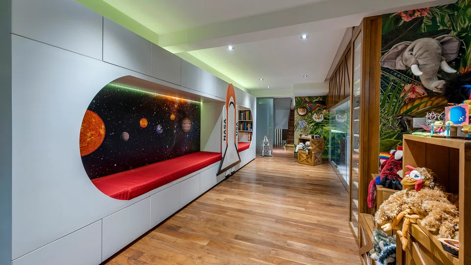 With a lap pool, an outdoor deck, their own bedrooms, and even an entire mezzanine dedicated to them, the children find it hard to get bored.