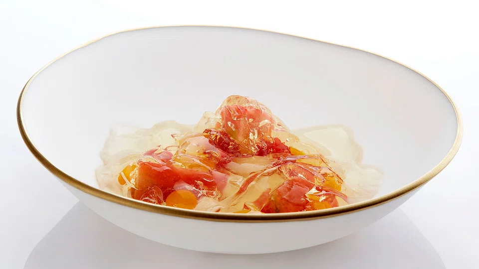 While the cuisine is a nod to his heritage, the Japanese aesthetic is very clear, particularly in the standout tomato course - a palate-cleansing clear jelly made of bonito-infused tomato water made with the Japanese amela varietal, matched with tomato sorbet, and filled out with the vibrant fruit.