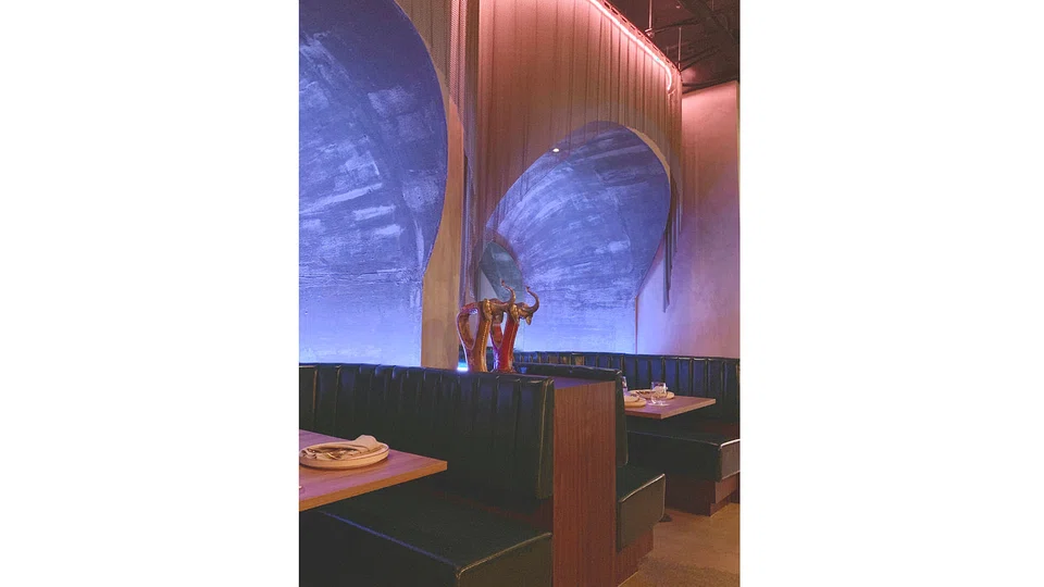 Crammed with enough colours to make up a Pantone chart of purgatory hues, the restaurant is bathed in a pervasive orange light that tries to outshine the golden bar that fronts a wall of pink liquor display shelves. Two mesmerising blue booths have a mirror set into their concave walls - we avoid them since supernatural TV shows tell us that they are the eyes of an abyss that will suck you in for an eternity decorated in ornate furniture. Instead, we plonk ourselves on blood-red upholstered chairs and try to avoid eye contact with any other colours we haven't met before.