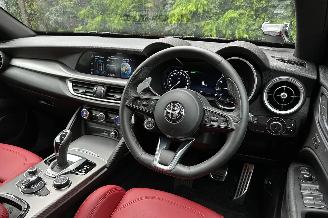 The dashboard’s overall layout makes the Alfa look dated inside, but I’m glad the Stelvio’s facelift didn’t bring in a giant screen to control every last thing. You still get a raft of physical buttons for the climate system, and what a relief that there’s still a knob to turn the music up and down with.
