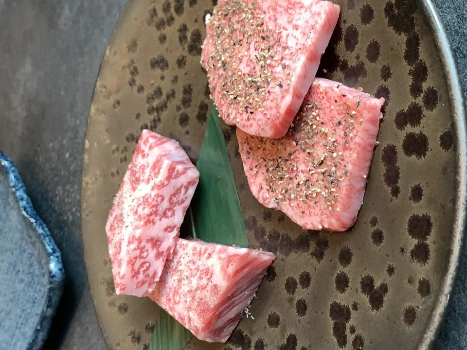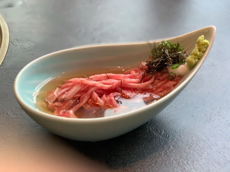 Medallions of Australian wagyu tongue spend a longer time on the heat and are sliced into chewy, bouncy nuggets that are good on their own or with a touch of yuzu kosho.