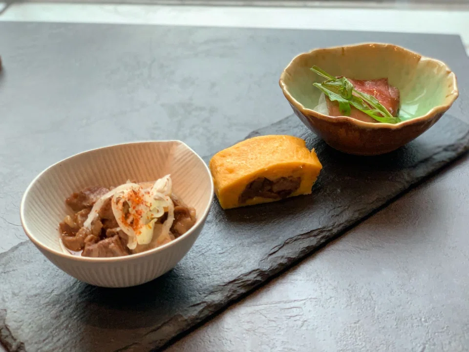 A little oily but robust and smooth, the steamy custard is studded with melty-soft bits of meat. It's a prelude to a beefy parade including a trio of appetisers comprising a rolled beef omelette, simmered meat in a sweetish sauce and tender slices of cold roast beef.