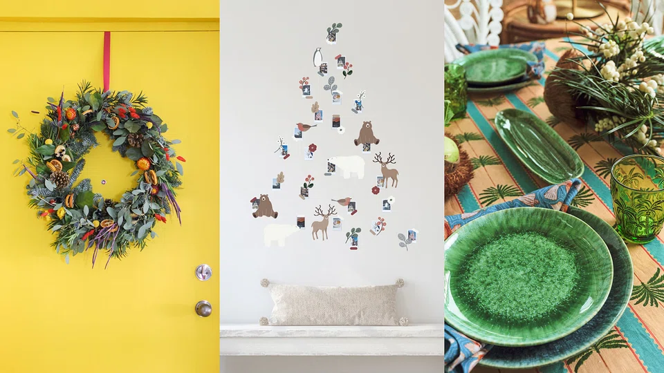 A quick way to add a festive touch is to hang a wreath on the door. Traditional ones are made with red ilex berries and fresh nobilis pine leaves. If you are looking for something different, consider Wonderland Botanicals' Bright Fruity Floral Wreath. Each is made with strawflower, craspedia and red wheat together with dried orange slices.