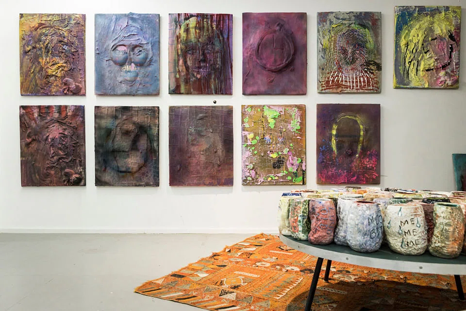 She also left behind a surprising amount of new work, created during the pandemic. Five series were at various stages of completion, from dozens of lumpy, slogan-bearing ceramic cups, made from a mould of a furball from her cat Bandit, to a set of brilliantly coloured, elusively rendered resin-based portraits that will debut at the Venice Biennale in April as part of Cecilia Alemani's group show, The Milk of Dreams.
