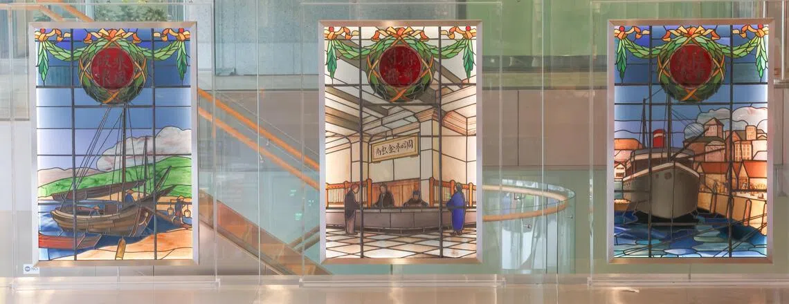 Prominently framed at the entrance of the OCBC Centre are stained glass works brought over from the original OCBC building, and which depict the history of the bank.