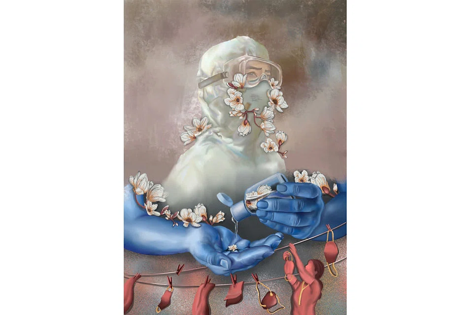 The digital artwork titled Our True Heroes was created as a tribute to "frontline workers who risk their lives every day to care for those who are infected by the virus," says Guillet. "Masks and hand sanitisers have become part of our daily lives. So the image includes a woman hanging her masks alongside her laundry as an everyday activity."