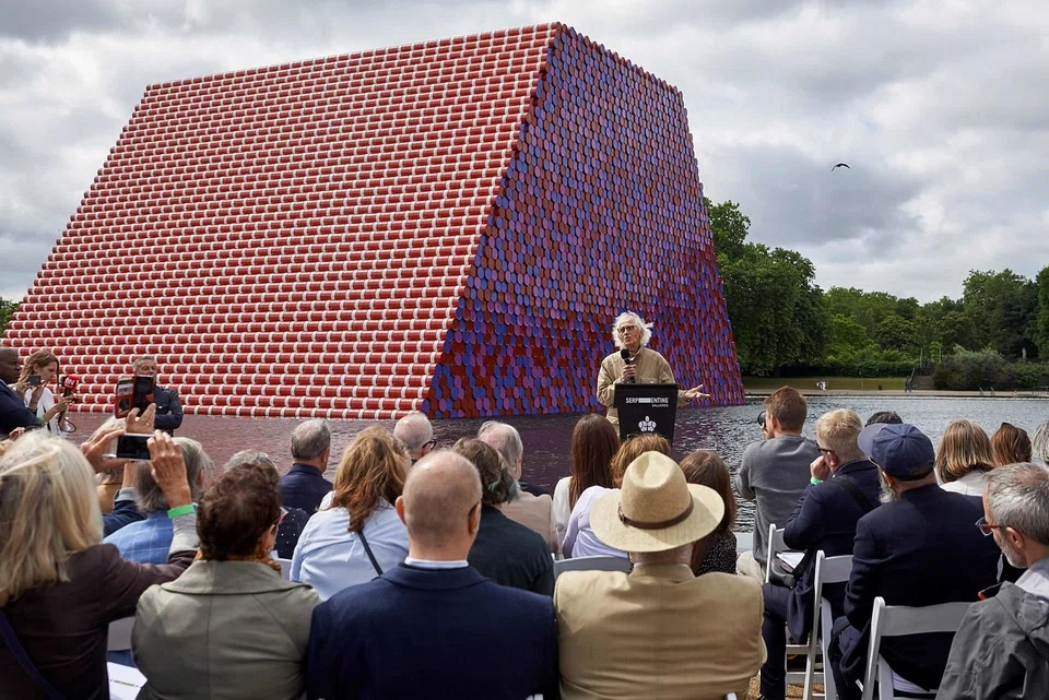 Artist Christo floats tomb of barrels in London's Hyde Park