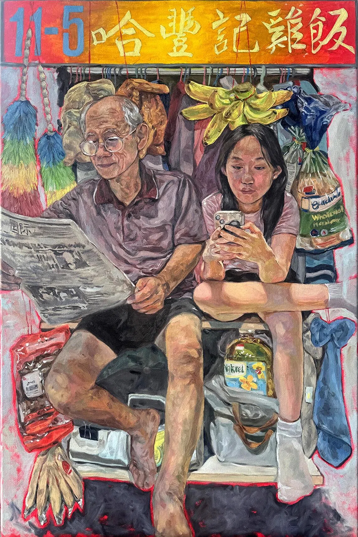 In Chua’s painting, an elderly man and a young girl sit shoulder to shoulder in a cramped room – he with his newspaper, she with her phone. Around them hang bunches of bananas, a loaf of Gardenia bread and feather dusters, familiar symbols of daily life in Singapore.