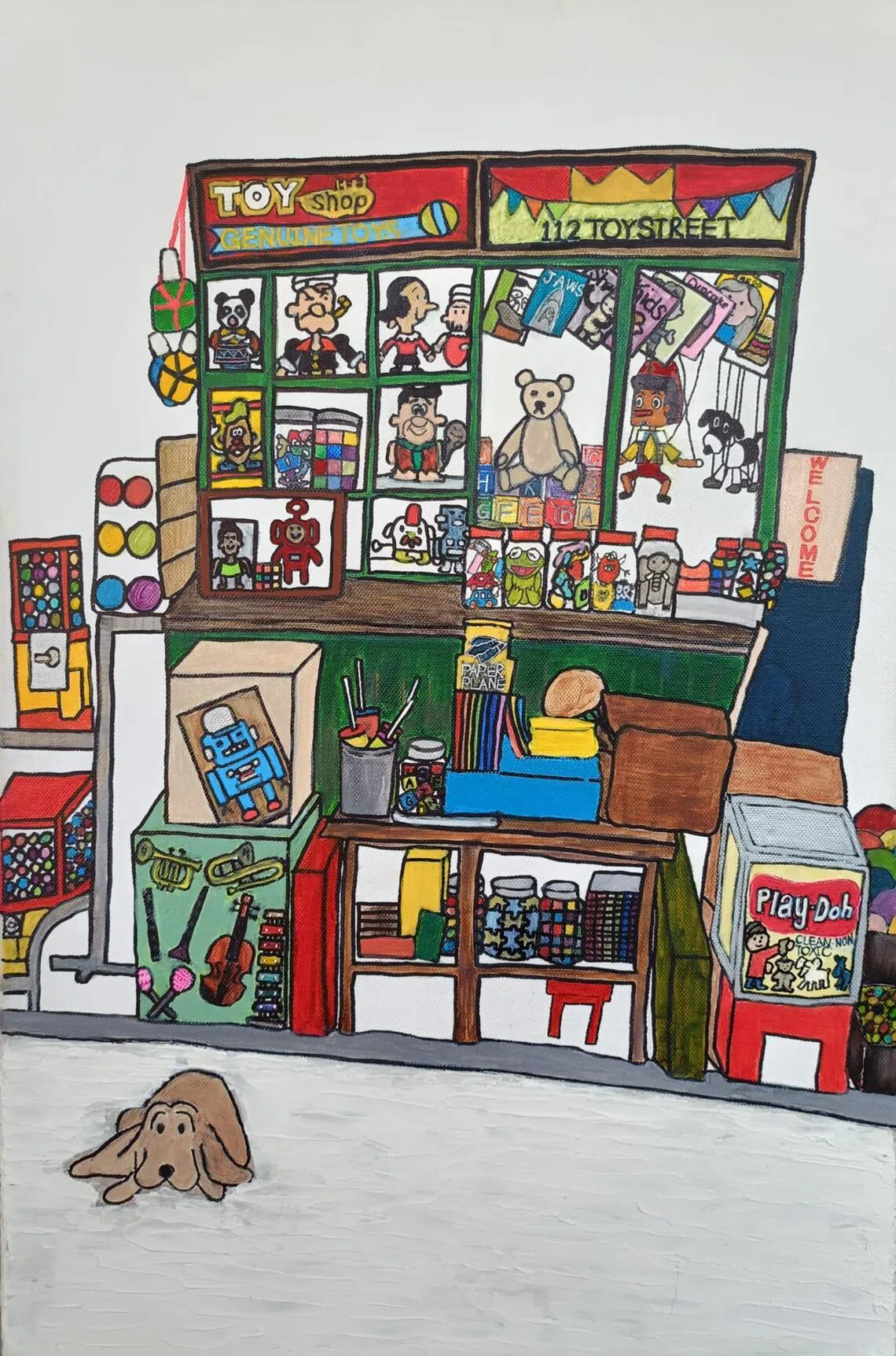 If Joey Chua’s painting evokes nostalgia, Won’s The Little Toy Shop radiates joy. His canvas teems with plush bears, robots, marionettes and candy jars, each neatly arranged yet bursting with colour and life – a child’s dream of playtime made real.