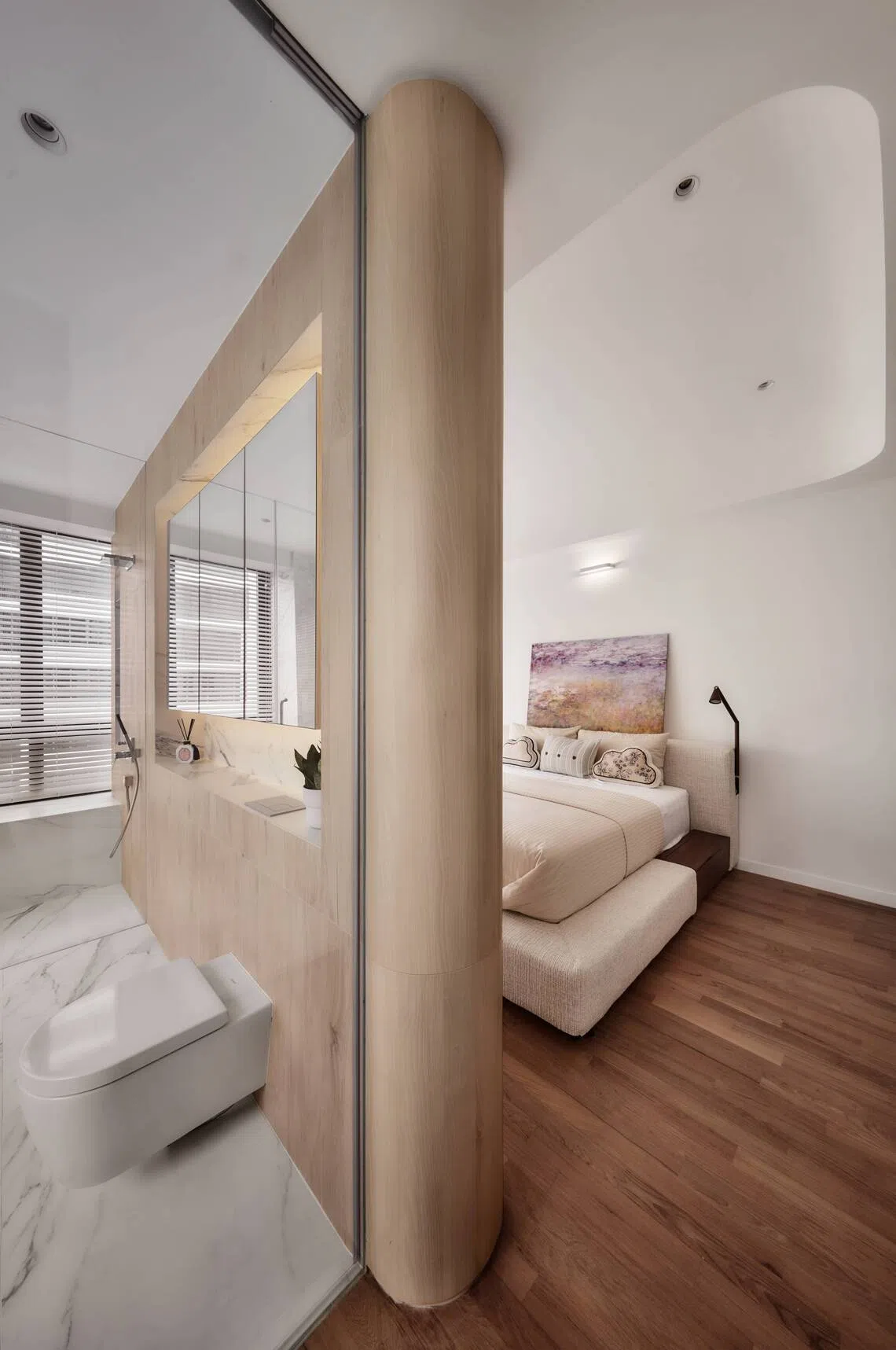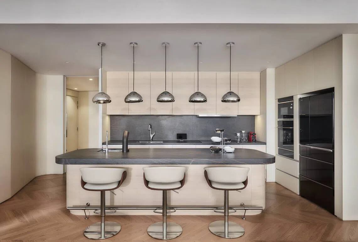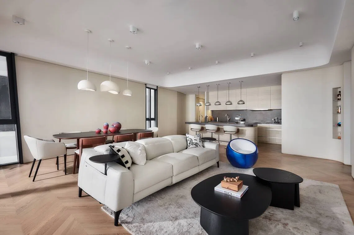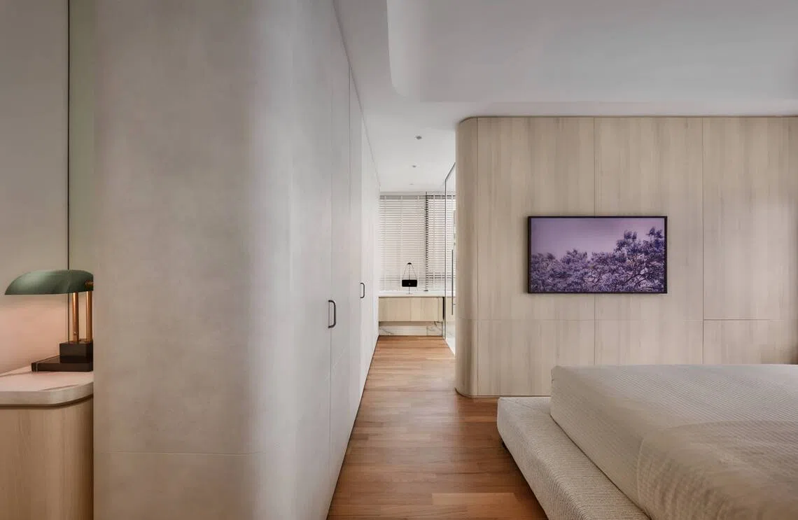 In tackling d’Leedon’s famously challenging angles (and hiding a couple of beams), Puah introduced gentle curves and concave shapes in the form of rounded corners and box-ups along the ceiling.