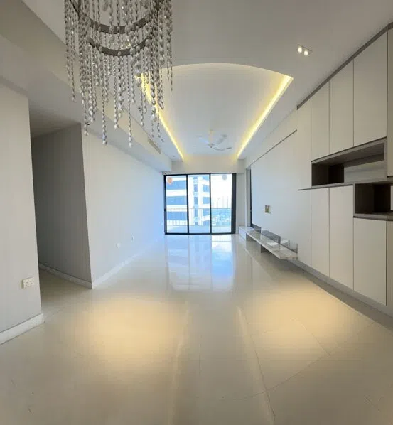 The wall adjoining one bedroom and living room was removed, doubling the living area, which now enjoys sweeping views and opens out seamlessly to the large balcony. The space became large enough to accommodate a dining table as well.
