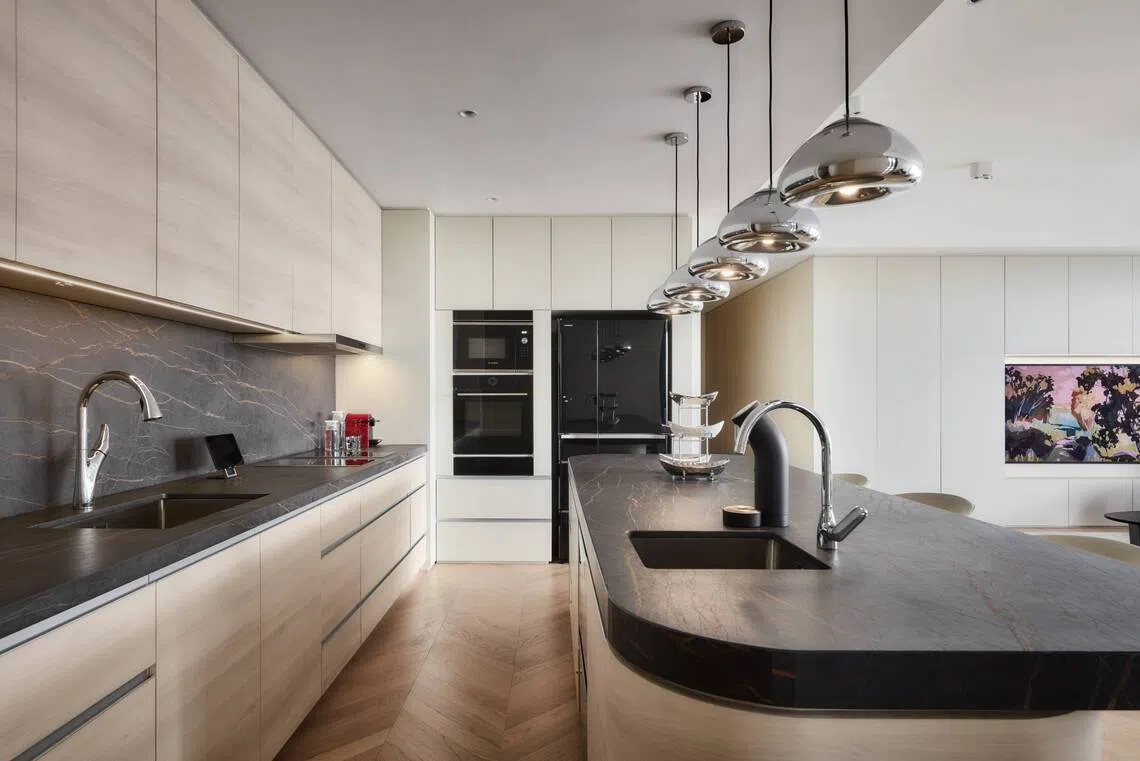 It also means the kitchen can be moved forward, taking over areas previously occupied by the dining area and a small utility room meant for live-in help. The new open concept was conceived as a social hub, and showcases a three-metre long showpiece island that doubles as a workspace.