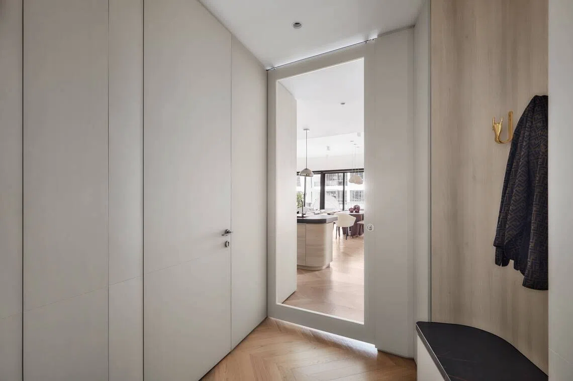 While reconfiguring the home, Puah worked in elements of a landed home into the apartment. Besides installing a large kitchen island, he refined the design to introduce a proper entrance foyer, complete with a custom-designed bench and coat rack.