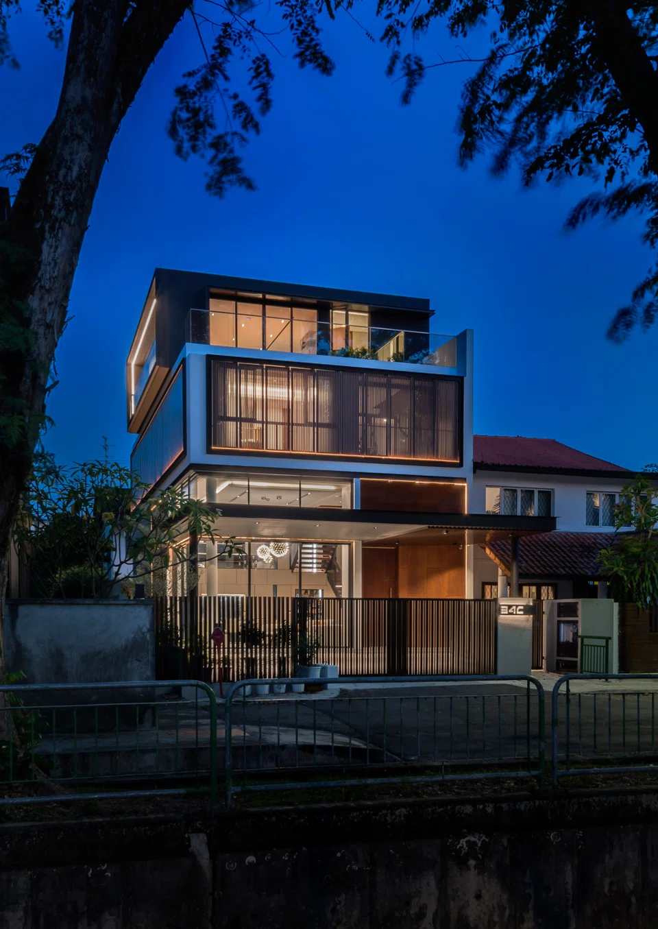 For Chua, that meant the opportunity to try something different – maximising internal volume by fitting four levels of living space into the typical two-and-a-half-storey envelope control set by the authorities. He managed to achieve this by stacking volumes – horizontal “boxes” arranged one atop another, and cantilevered ever so slightly.