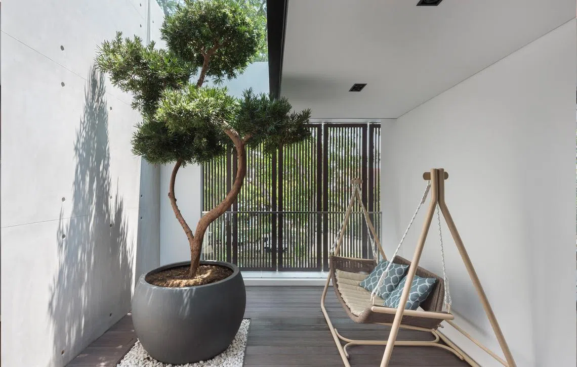 Apart from increasing internal space, the stacking of volumes also had the benefit of creating open spaces in various parts of the house. There is a balcony at the back of the mezzanine, a semi-open, breezy terrace with a swing chair and bonsai tree next to the master bedroom (now the wife’s favourite spot in the house), and an expansive attic bordered on three sides with terraces and a balcony.