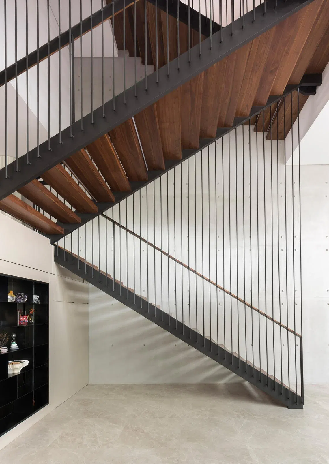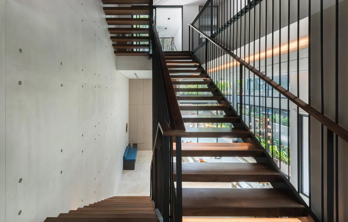 This starts from the continuous living and dining space that opens to the garden, with large sliding glass panels to allow for natural light and cross-ventilation. Further aiding light penetration within the house is a staircase with open risers, its long, slick metal balusters enhancing the visual sense of height.