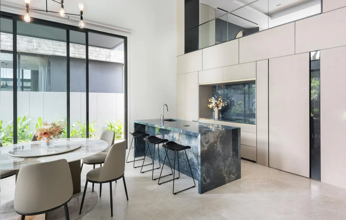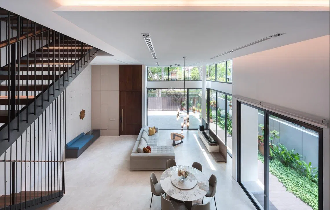 Chua envisioned a “modern, iconic home” suited to Singapore’s tropical climate. “Hence, the internal spaces had to be designed to encourage ample sunlight, natural breezes and a seamless connection to the outdoors,” he says.