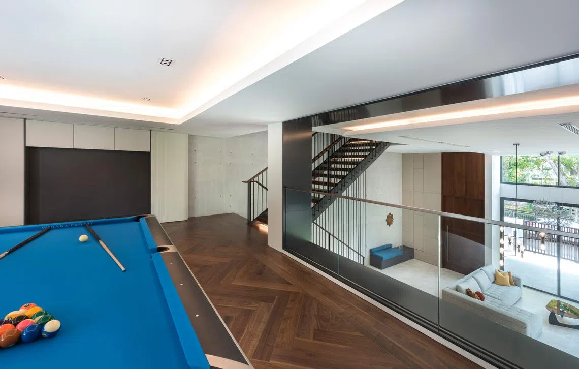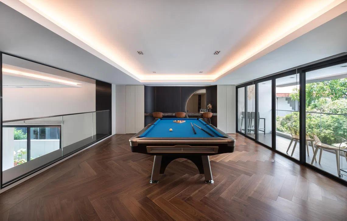 Along the construction journey, the Angs, who regularly welcome friends at their home, also made important modifications to the design of the house. They decided against enclosing the mezzanine floor, which functions as an entertainment space as well as a yoga area. This has allowed better flow of light and air, and ensures that the room – whose centrepiece is a tournament-sized pool table – has a large aperture that overlooks the living and dining areas below.