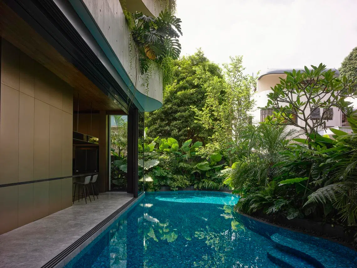With so many spaces within its built-up area of 7,200 sq ft, the house could easily have become a single, monolithic block. Han avoided this by breaking the architecture into four distinct components: the car porch topped with a green roof; the front study shielded with timber-like aluminium fins for privacy; the stair core wrapped in white concrete screens with glass infill panels; and the rear bedroom block softened with organic edges and greenery-draped balconies.