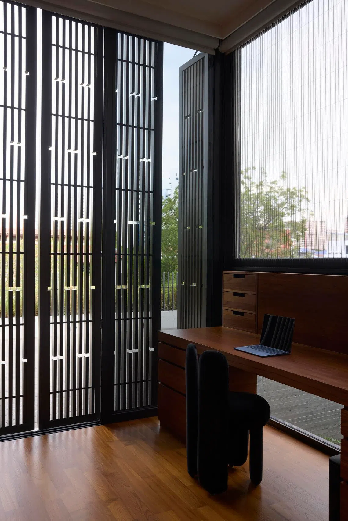 “It also provides privacy, shading and microclimatic comfort,” says Han. On arrival, there is a strong sense of place, reinforced by concrete breeze blocks that separate the car porch from the courtyard.