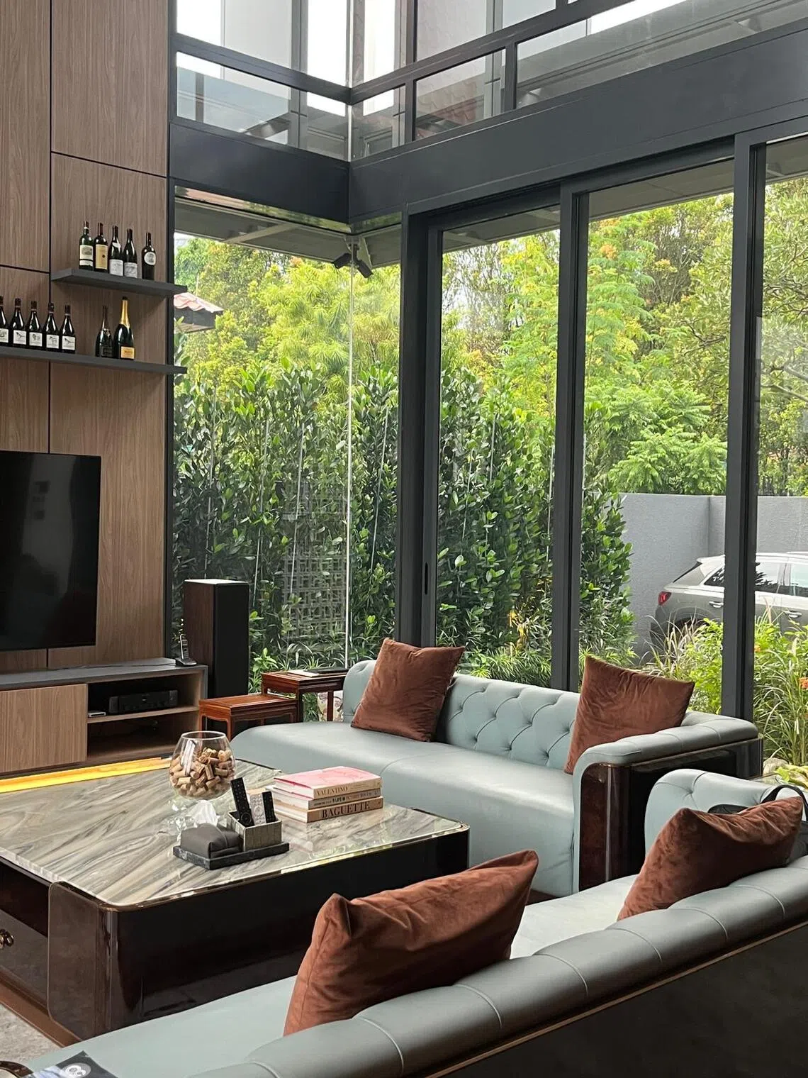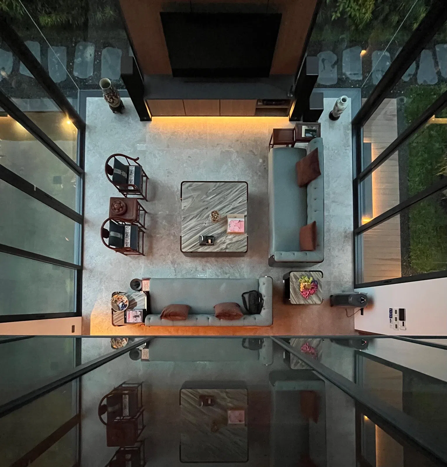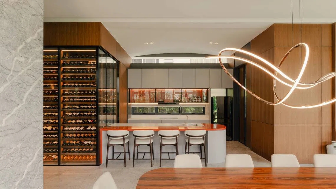 But what truly strikes you upon entering is the double-storey, glass-wrapped living area that sits like a jewellery case, bringing the front and rear views of the house together. Not only does it create a grand entrance, it also offers a glimpse of what’s to come in this abode, built on land that spans 45 m in length at its deepest.