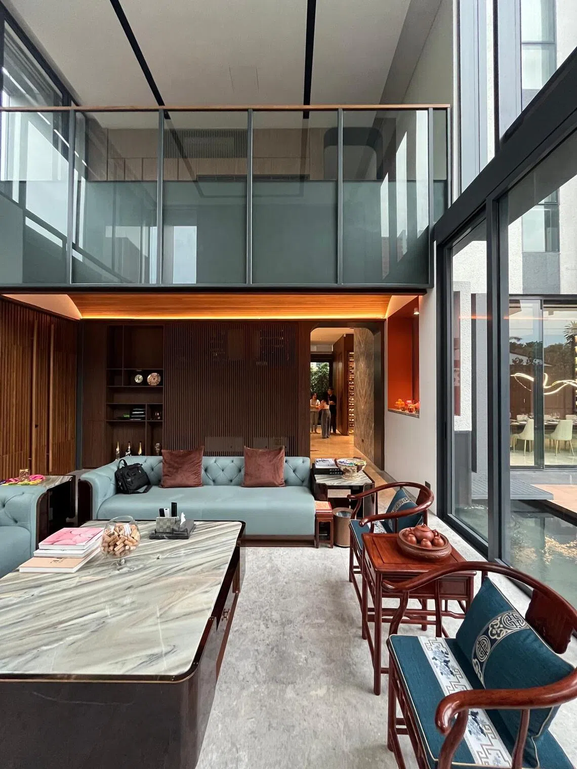 Adjacent to the living area are several spots designed for the family’s various hosting needs. The main dining room in front is more formal, ideal for serving Chinese cuisine on a custom-made, 12-seater round dining table with built-in induction and an automatic lazy Susan.