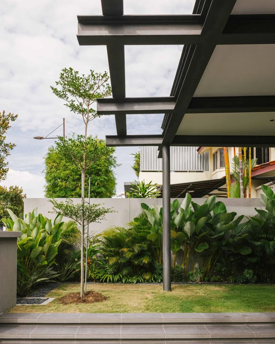 For Matou House, a lightweight steel pavilion on the first storey expands the house outward and allows a complete reorganisation of its internal layout. The steel exoskeleton brings openness and permeability to the home, with a glass-clad living room introduced at the front of the house. It also created more footprint at the side for the kitchen, and at the back for a good-sized granny room.