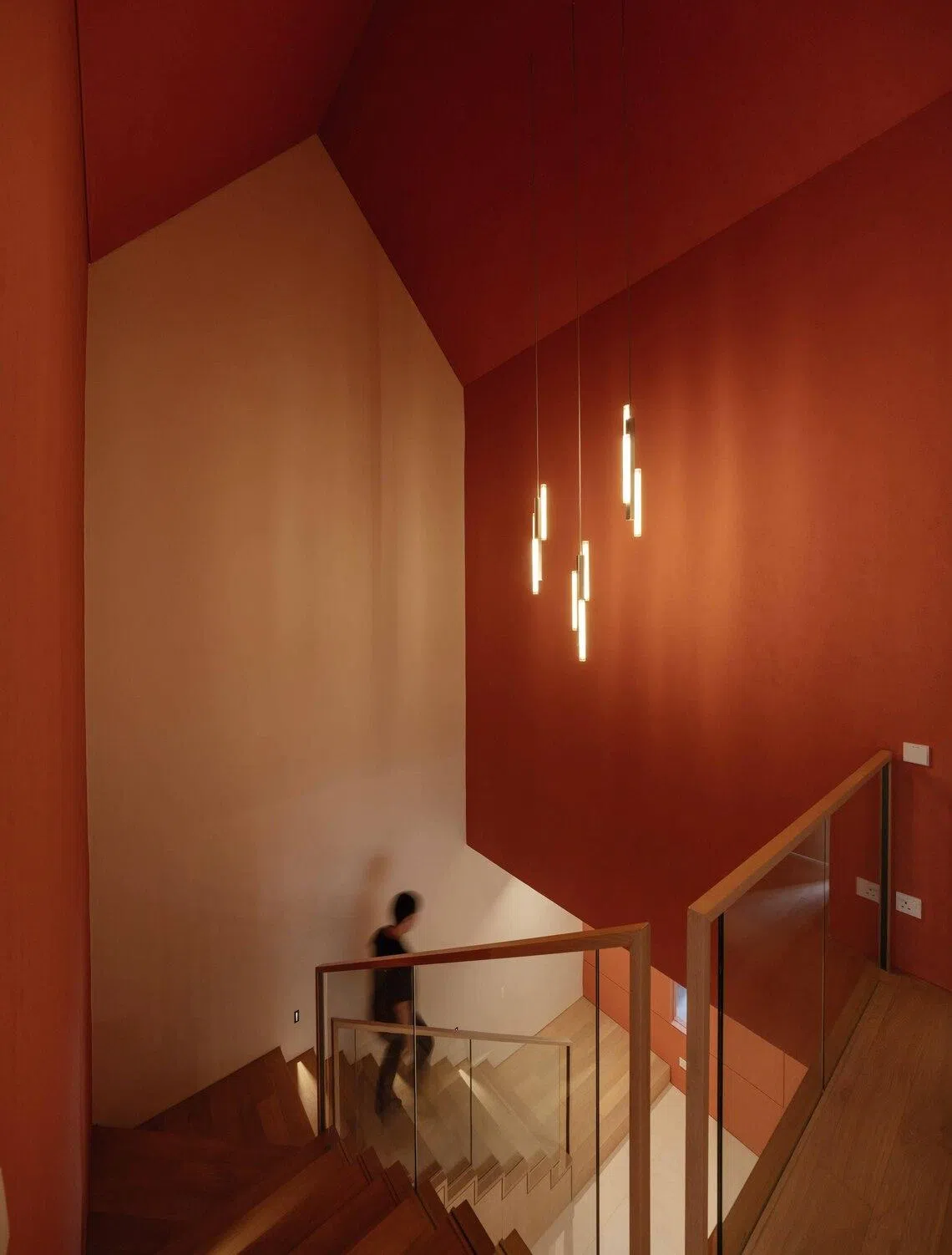 Also at the core of the house is a stairwell and void that Keng describes as the spatial and emotional anchor of the project. Clad in textured, terracotta red, it calls for attention with its eye-catching hue in a home that’s mainly light and neutral in its colour palette.