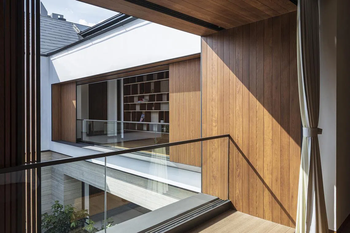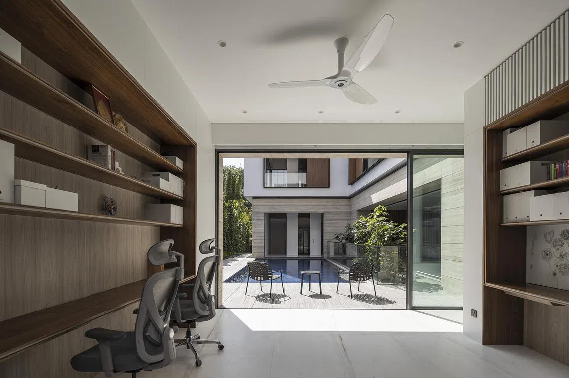 Khua also insisted that the staircase be tucked to one gabled edge and fronted with screens so that at night, this part of the house becomes a sort of lantern, glowing with filtered light. Tan placed it at the front of the house together with the elevator. This circulation core buffers the living and dining area, which bends around the courtyard to cradle the study room.