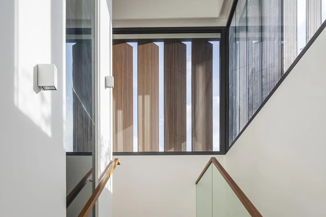 Khua’s mother comes to stay with the family occasionally, and her room is on the second storey, facing the road but screened off by a timber brise-soleil with a timber-print finish. This material clads parts of the facade, giving the house a warm countenance. On the first storey, it covers the entrance walls and ceiling, and tapers upward in a welcoming gesture.