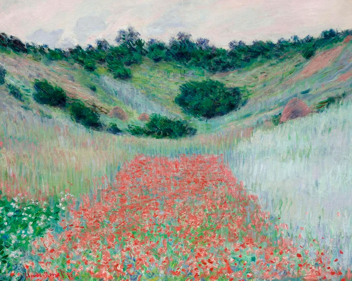 There’s Claude Monet’s Poppy Field in a Hollow Near Giverny (1885), capturing a summer afternoon frozen in time, the poppies blazing red against rolling green hills. There’s Pierre-Auguste Renoir’s Dance At Bougival (1883), where pink-cheeked lovers twirl beneath a haze of sunlight and laughter.
