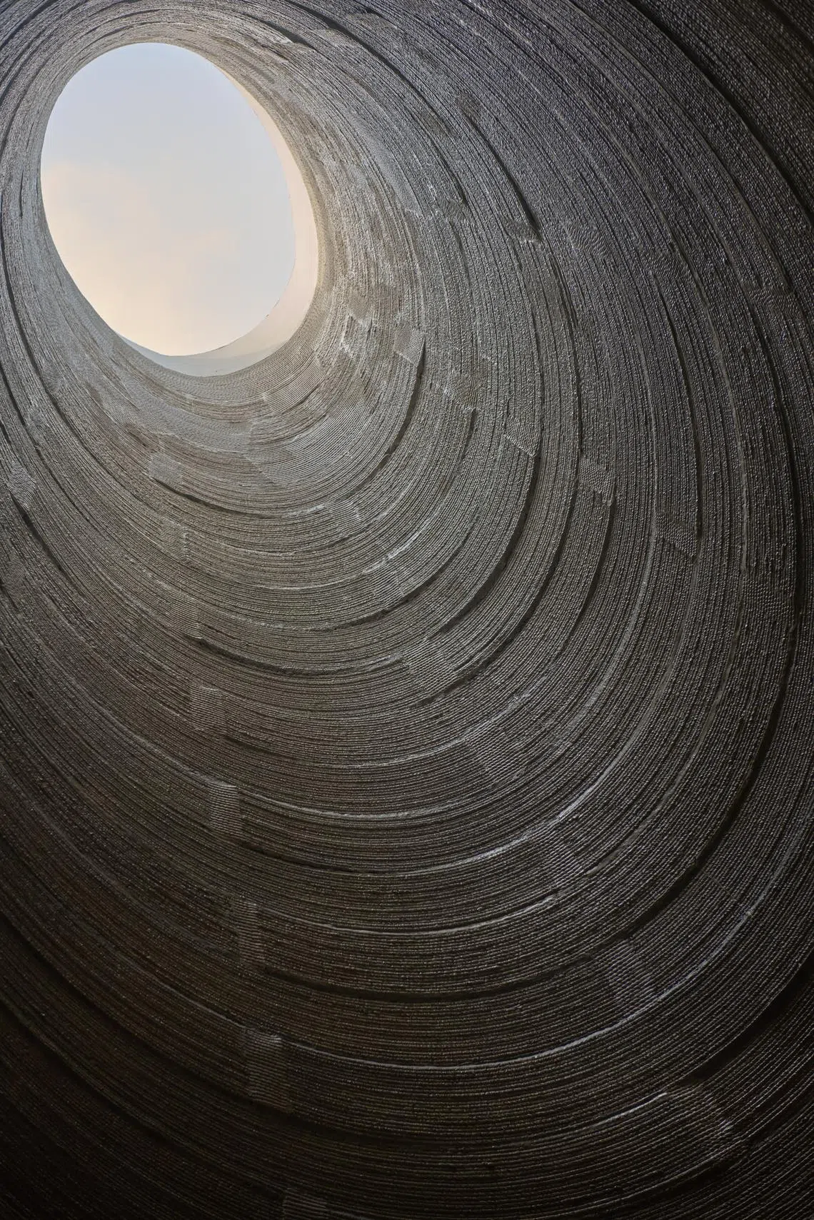 The entire structure pivots around a dramatic cylindrical void – an oculus that rises from the dining room floor to a skylight above. This centrepiece – referred to in the family as “the cone” – doesn’t just dramatise the architecture. It also performs. Hidden within its striated 3D-printed walls is a passive ventilator typically found in factories, drawing hot air upward and out.