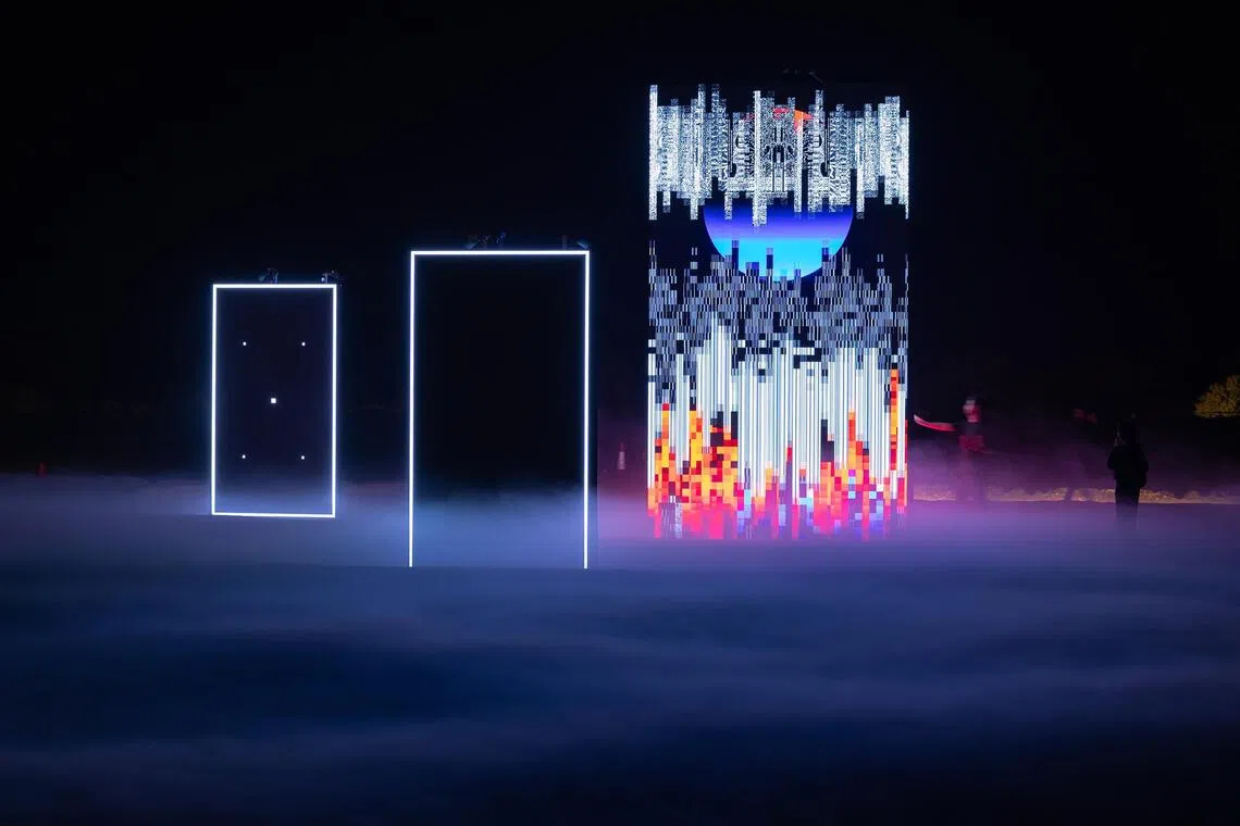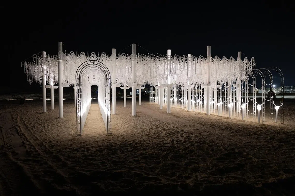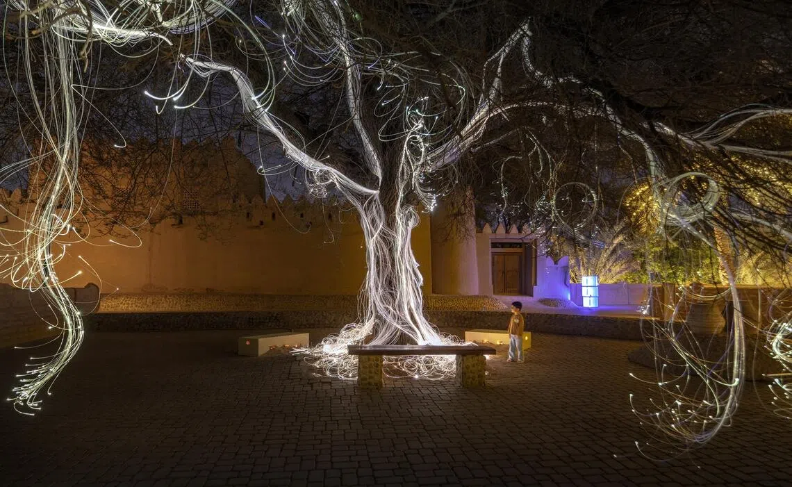 The gems among the exhibits include Rafael Lozano-Hemmer’s Pulse Canopy, which transforms visitors’ heartbeats into long glowing beams that shoot into the night sky, as well as Translation Stream, which projects contemporary Emirati poetry as flowing ribbons of light across buildings and pathways.