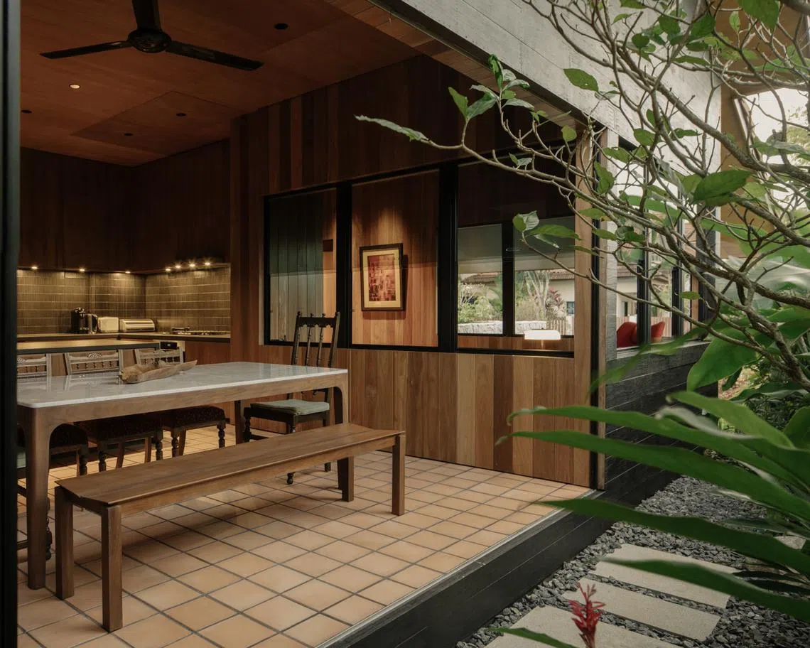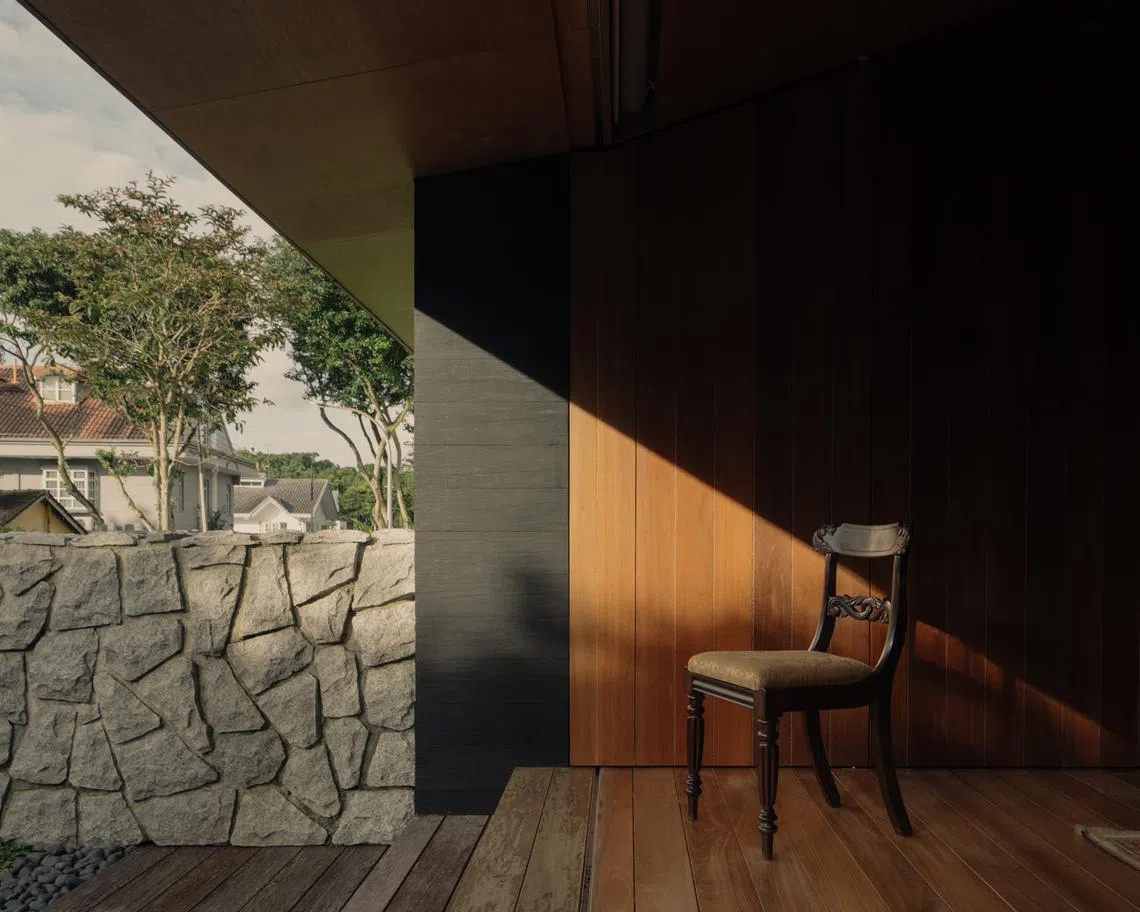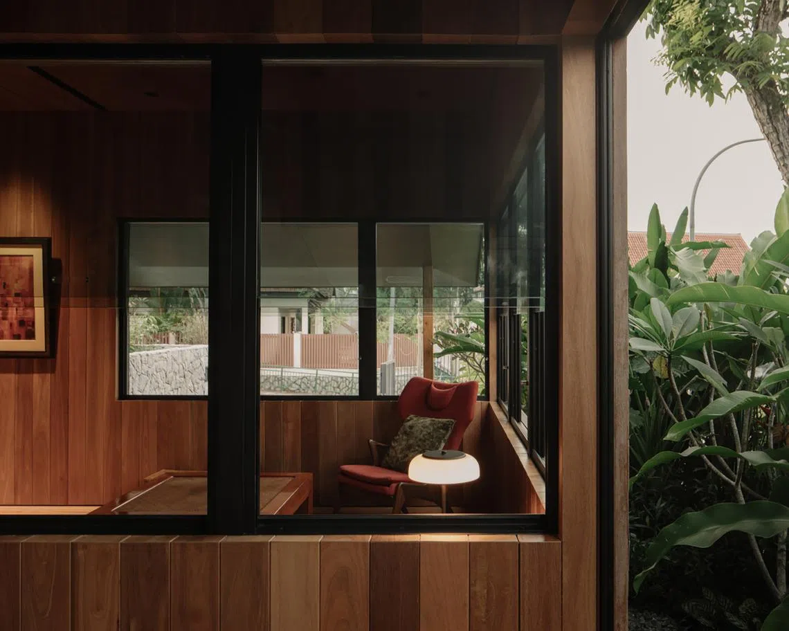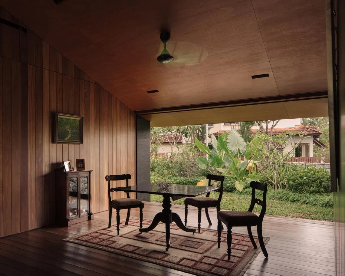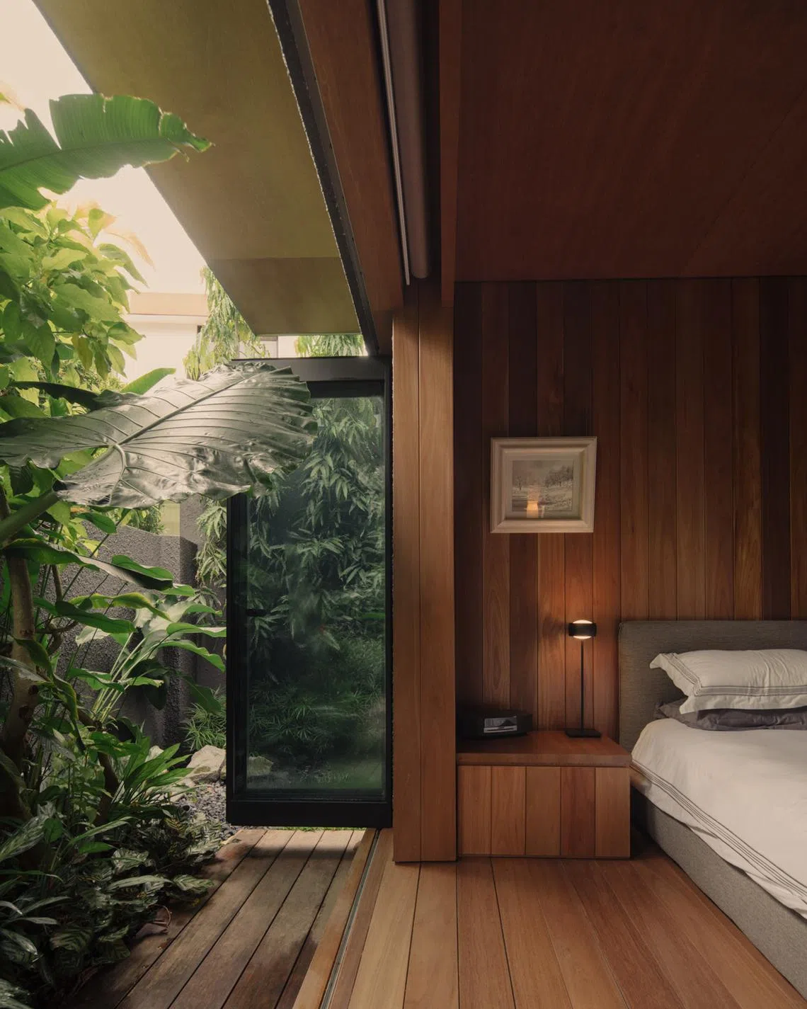 Meanwhile, just like the three ensuite bedrooms, the light-filled kitchen-cum-dining area opens up to a garden. From the kitchen, one can access the guest bathroom and helper’s quarters. But the entryway, which is flushed with and looks just like the rest of the timber-clad walls, is discreet to the point of being imperceptible.