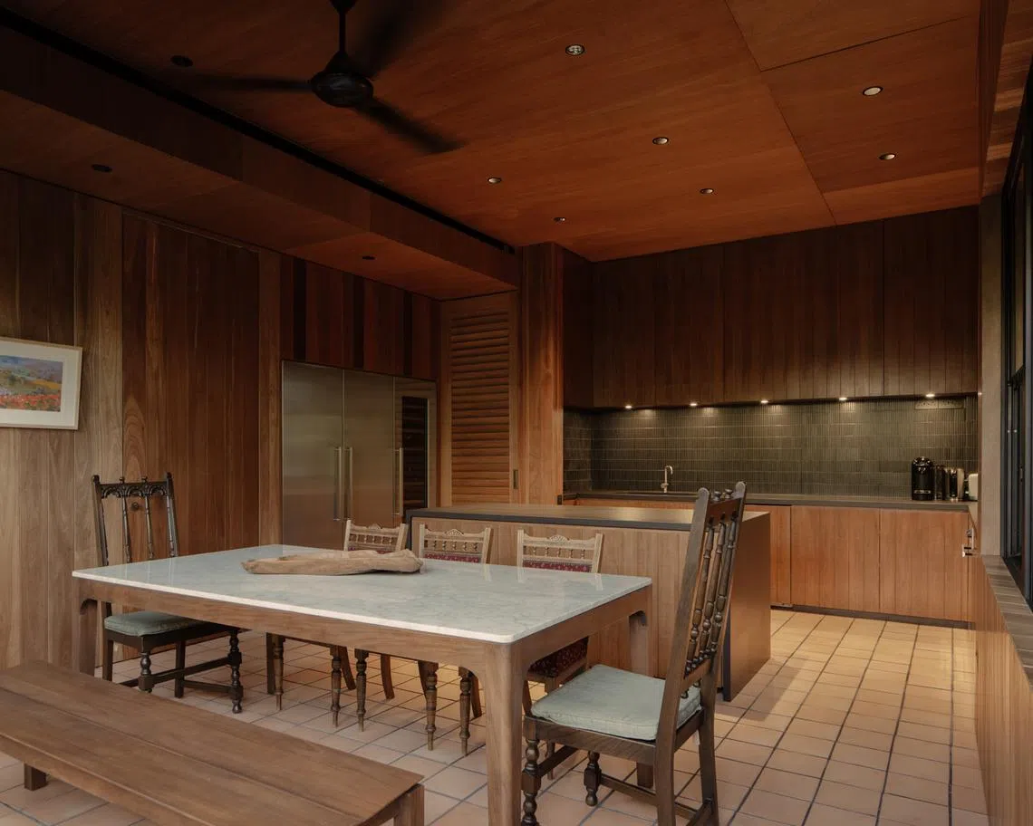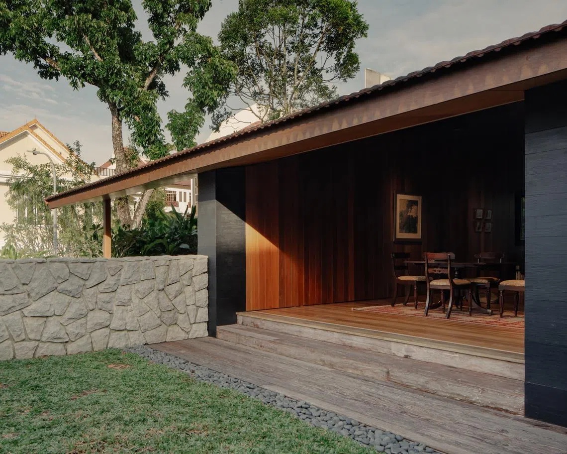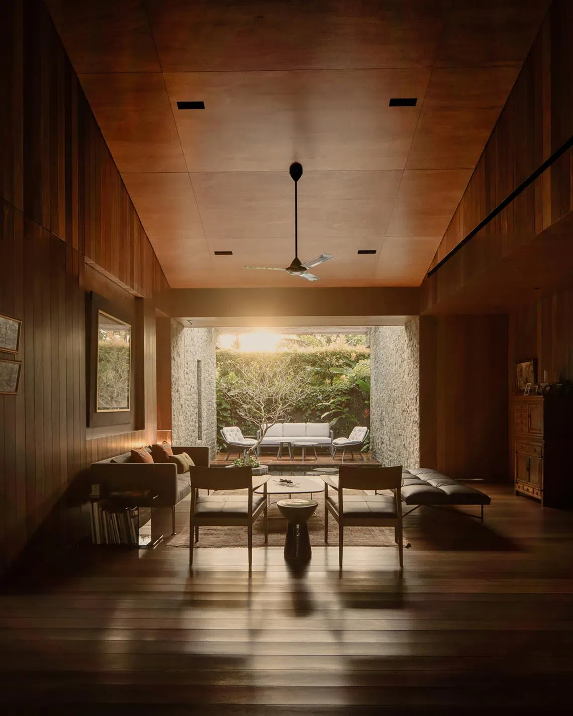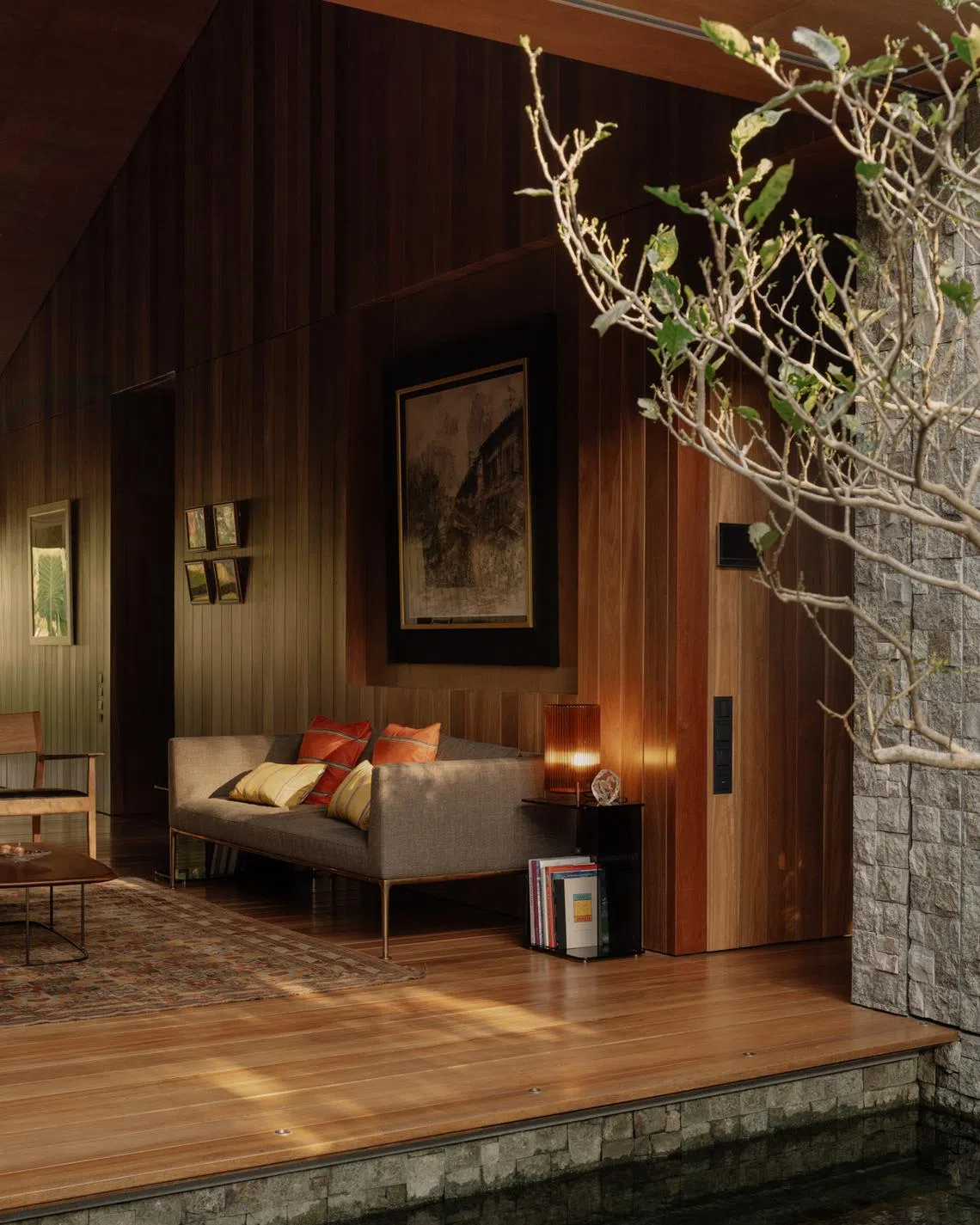 Meanwhile, just like the three ensuite bedrooms, the light-filled kitchen-cum-dining area opens up to a garden. From the kitchen, one can access the guest bathroom and helper’s quarters. But the entryway, which is flushed with and looks just like the rest of the timber-clad walls, is discreet to the point of being imperceptible.
