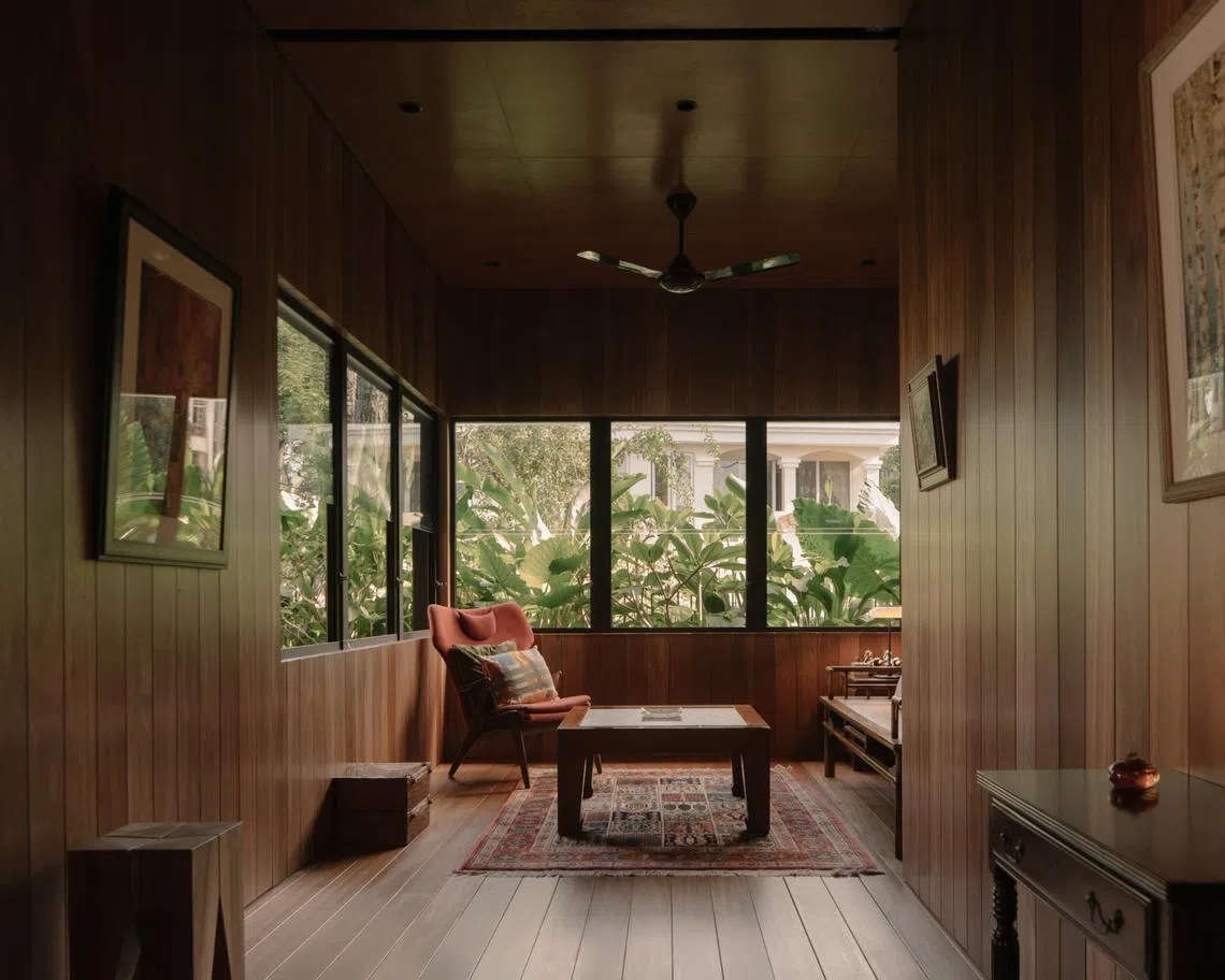 This gave Chang pretty much a free hand to conceptualise the new home. He started by retaining the property’s rubble boundary wall and old pitched roof profile. Then he levelled the previously sloping driveway to make space for the car porch. From there, a few steps lead up to a wonderful, elevated vestibule, which acts as a welcoming space for visitors away from the more private quarters of the home.