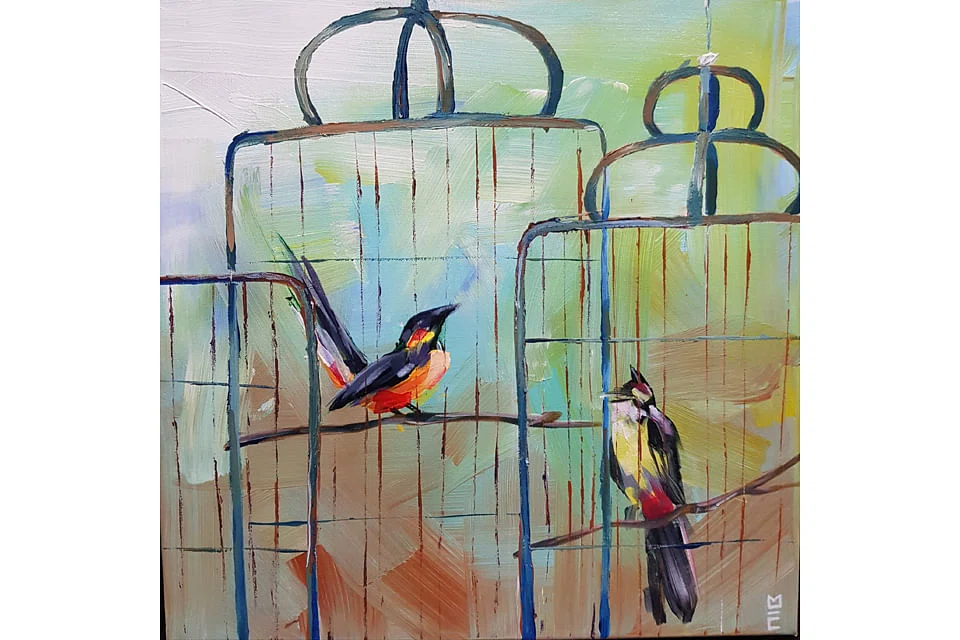 TWO songbirds sit in their cages and sing melodic songs. The birds are deftly painted with confident brushstrokes and thoughtful details. They're so caught up in their singing that their cages appear to recede into the bright background, painted in warm hues of yellow, green and brown.