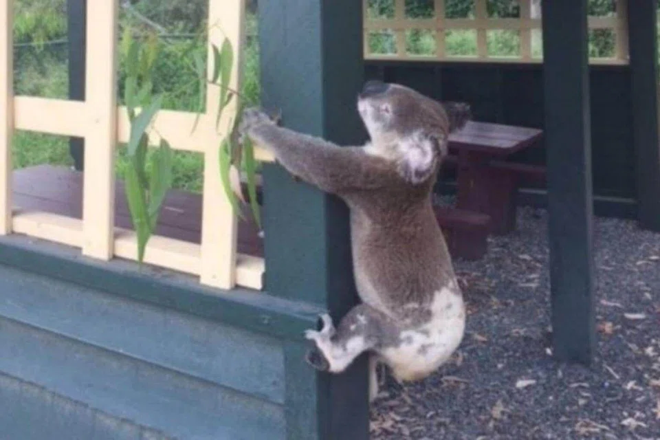 It shows the small koala, limbs wrapped around one of the shelter's wooden supports, appearing to clutch a bunch of gum leaves. The caption says "all is not as it seems". It gives the location as a lookout at Brooloo Park, 140 km north of the city of Brisbane in Queensland state.