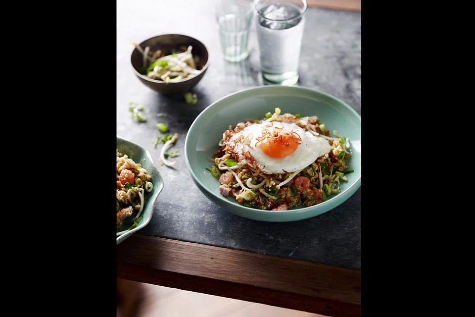 Return the chicken and bacon to the pan, then add the shrimp paste, cabbage and prawns and stir-fry for 2 minutes, or until the cabbage wilts. Add the cauliflower rice, bean sprouts, 2 tablespoons of fried shallots, tamari or coconut aminos, honey (if using), fish sauce and tamarind. Stir-fry for 2 minutes until heated through. Transfer to a bowl and keep warm.